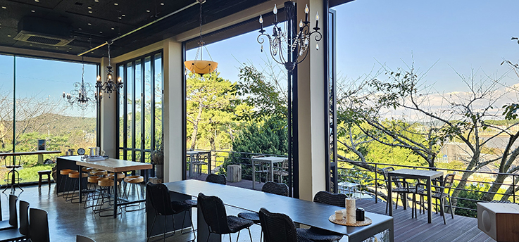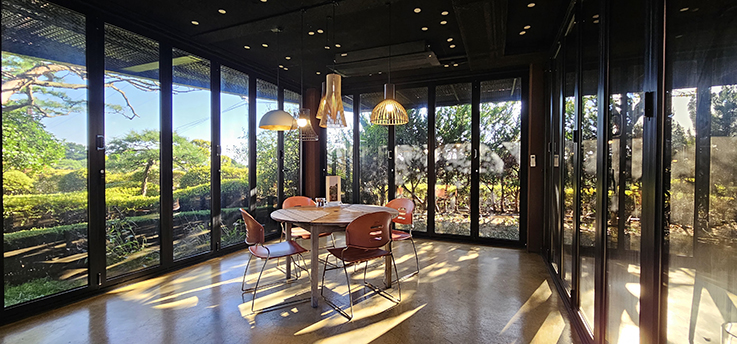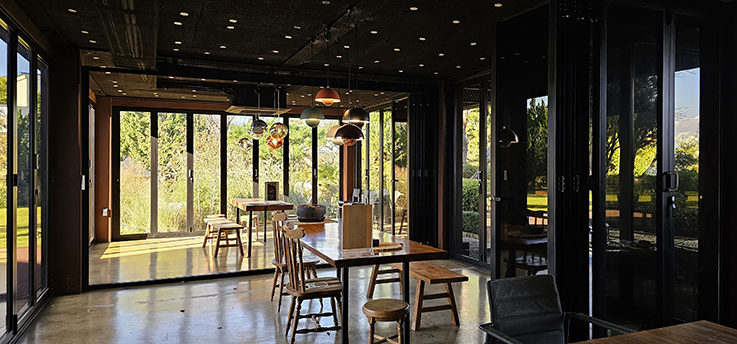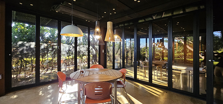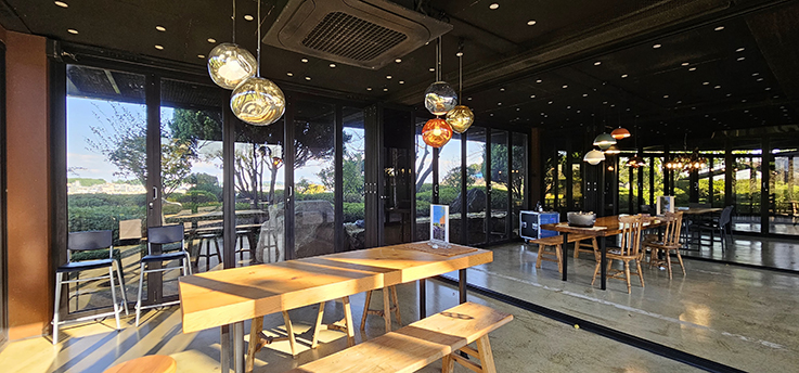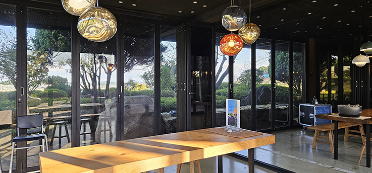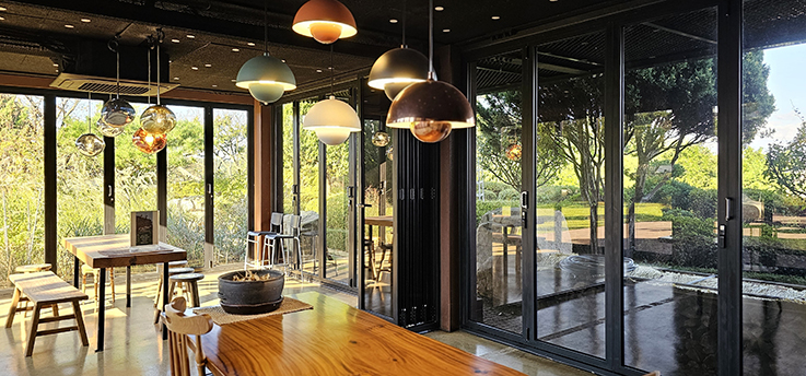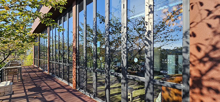 섬꾸지 카페는 방문 고객에게 더욱 여유롭고 개방적인 공간 경험을 제공하기 위해 테라스와 실내 공간을 자연스럽게 연결하는 폴딩도어 시스템을 도입했습니다.