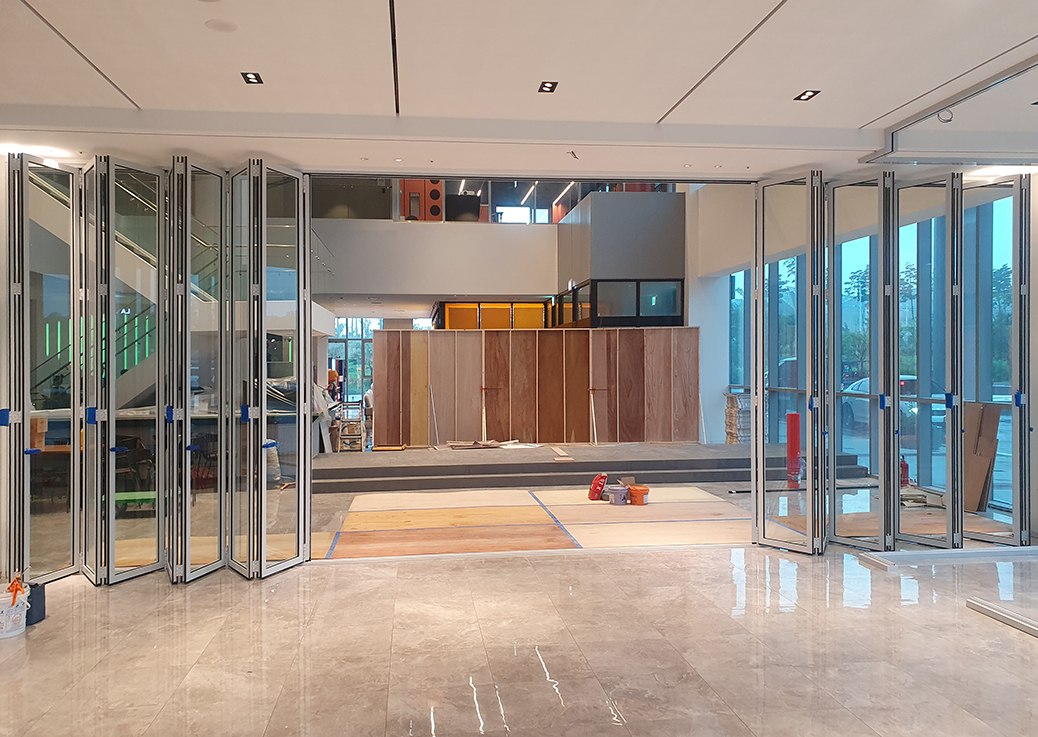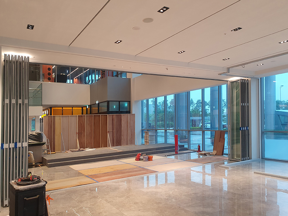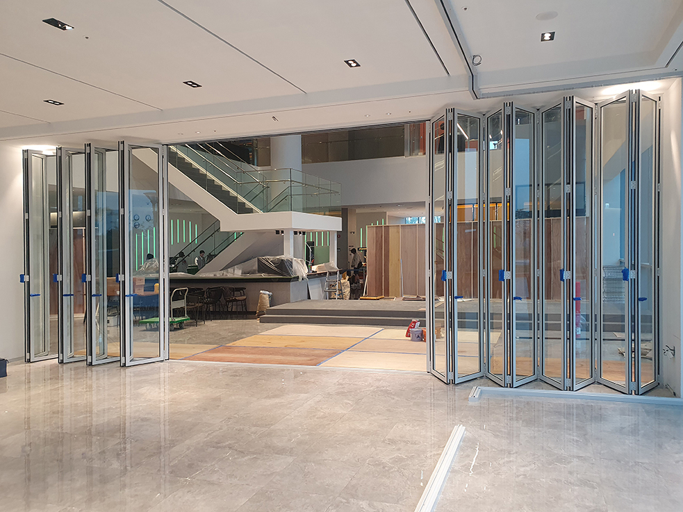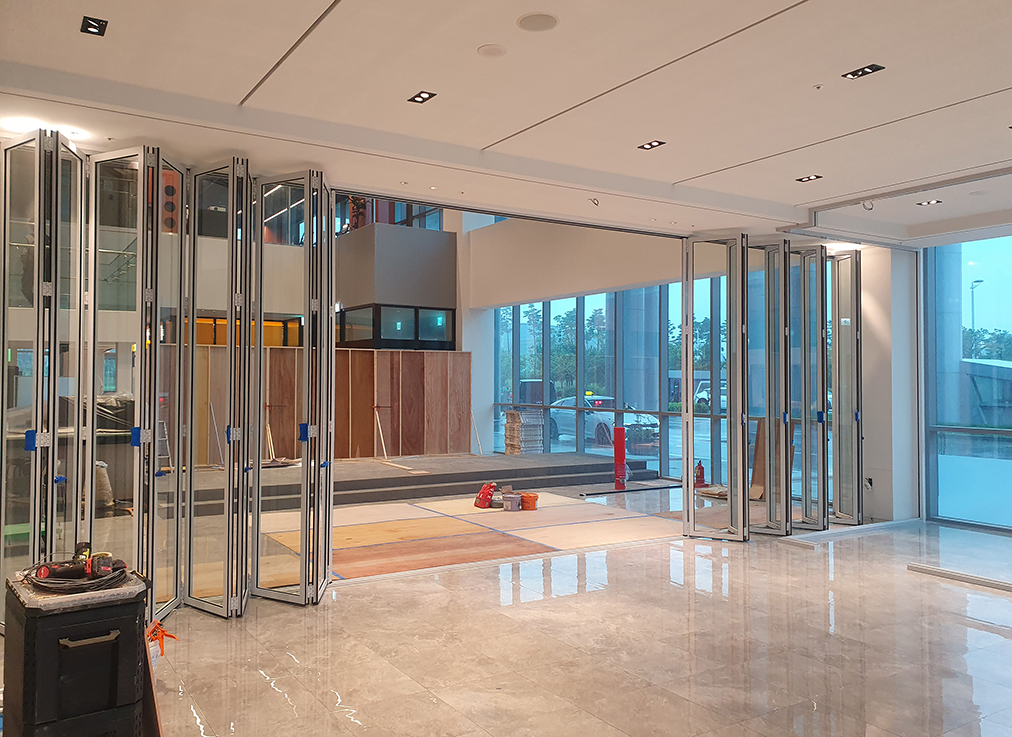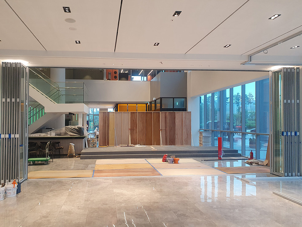 폴딩도어는 필요에 따라 공간을 나누거나 하나의 넓은 공간으로 활용할 수 있어 호텔 운영의 유연성을 높이는 장점이 있습니다. 또한 깔끔한 디자인과 부드러운 작동으로 호텔 공간에 자연스럽게 어우러지도록 완성했습니다.