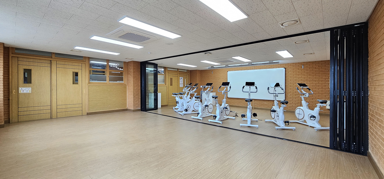 수원 연무초등학교 스피닝 운동 특별활동실에 폴젠코리아 프리미엄 폴딩도어를 적용하여 공간 활용도를 높였습니다.