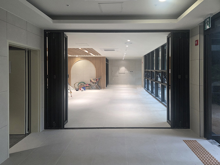 파주 운정 푸르지오 파크라인 2단지 오피스텔 1층 커뮤니티 공간에 90mm 단열 폴딩도어를 설치했습니다.