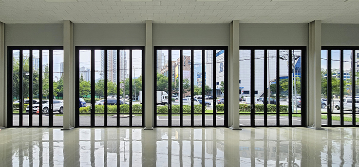 남양주 별내동에 위치한 신축 대형 물류센터에, 폴젠코리아의 폴딩도어가 시공되었습니다. 넓은 출입구 전면을 따라 시공된 폴딩도어는 대형 구조물에도 안정감 있게 설치되어, 공간의 규모감과 기능성을 동시에 완성했습니다. 설치된 폴딩도어는 고강도 알루미늄 프레임을 적용해 단단한 인상을 주며, 개폐 시에는 부드러운 슬라이딩 동작으로 물류 장비와 차량이 자유롭게 이동할 수 있는 넓은 개방폭을 확보합니다. 외관상으로도 건물 파사드와 조화를 이루는 슬림한 라인이 특징이며, 분할된 패널은 공간을 보다 정돈되고 모던하게 보이도록 설계되어 시공 후 전체적인 마감 완성도를 높였습니다. 내부에서 바라본 모습은 광폭의 출입구를 깔끔하게 접을 수 있는 구조로, 작업자의 동선과 물류 흐름을 방해하지 않으며, 필요 시에는 한 면 전체를 개방해 대형 차량 출입도 무리 없이 대응할 수 있습니다. 물류 흐름이 많은 현장일수록, 전면 개방이 가능한 폴딩도어는 최적의 선택이 될 수 있습니다.