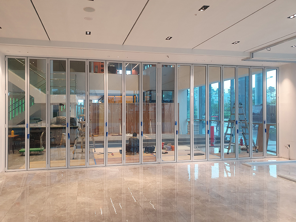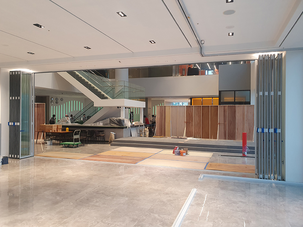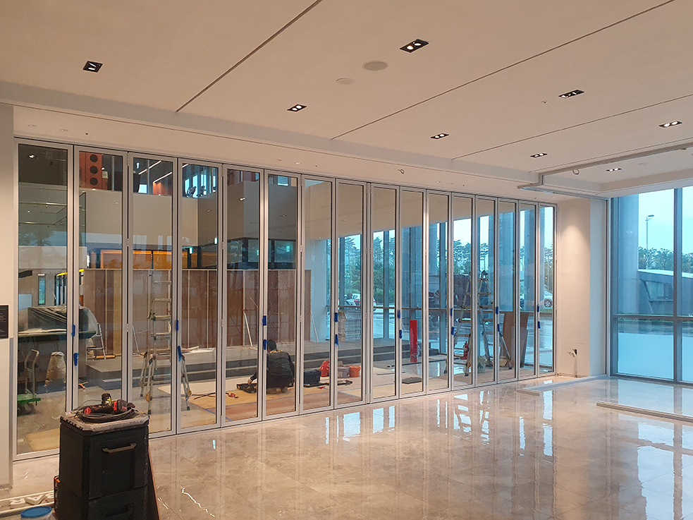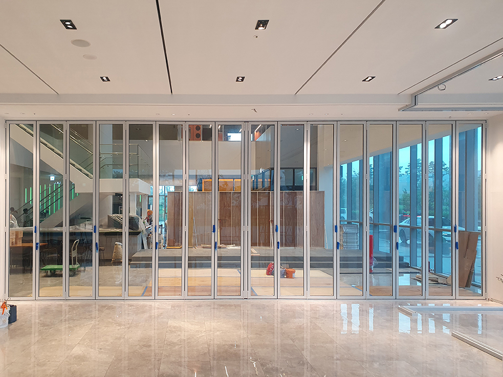 폴딩도어는 필요에 따라 공간을 나누거나 하나의 넓은 공간으로 활용할 수 있어 호텔 운영의 유연성을 높이는 장점이 있습니다. 또한 깔끔한 디자인과 부드러운 작동으로 호텔 공간에 자연스럽게 어우러지도록 완성했습니다.