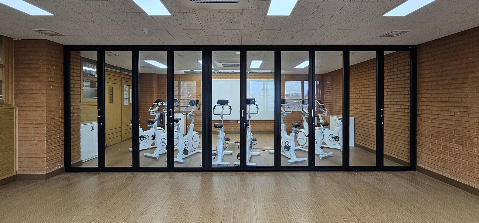 기존에는 고정된 구조로 인해 운동 수업 운영에 제약이 있었으나, 폴딩도어 설치를 통해 필요에 따라 공간을 확장하거나 분리할 수 있는 유연한 구조를 구현했습니다.