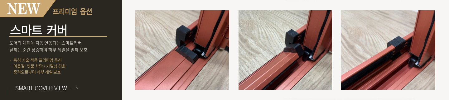 알루미늄(AL-6N01) 고합금 재질과 베어링 롤러 형태로 레일을 타고 주행시 부드럽게 개폐 할 수 있도록 설계